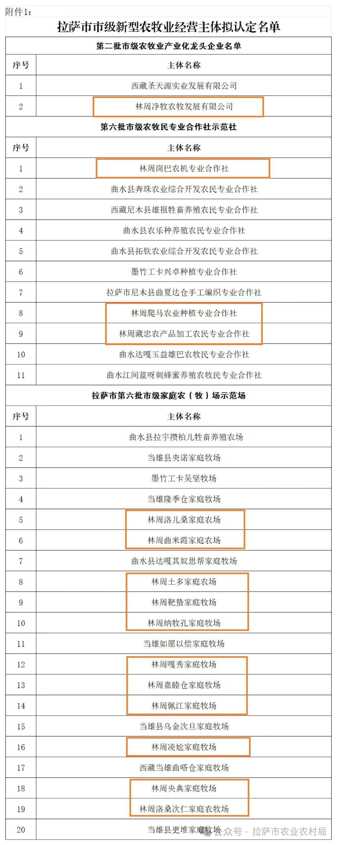 为贯彻落实2025年市委农村工作会议精神,根据《拉萨市人民政府办公室关于印发〈拉萨市关于持续促进农牧民增收的若干举措〉的通知》(拉政办发〔2025〕8号)、《拉萨市农牧业产业化龙头企业认定和运行监测管理办法》(拉农发〔2024〕27号)、《拉萨市农牧民专业合作社示范社评定及监测办法(试行)》(拉农发〔2025〕23号)、《拉萨市家庭农(牧)场市级示范场评定及监测办法(试行)》(拉农发〔2025〕24号)、《拉萨市培育壮大新型农牧业经营主体奖补资金管理实施细则(试行)》(拉农发〔2025〕26号)文件要求,经主体自愿申报、县(区)审核推荐、委托第三方审查、联席会议评审,拟认定西藏圣天源实业发展有限公司等2家公司为拉萨市第二批市级农牧业产业化龙头企业、林周岗巴农机专业合作社等11家合作社为拉萨市第六批市级农牧民专业合作社示范社、曲水县拉宇攒柏儿牲畜养殖农场等20家家庭农(牧)场为拉萨市第六批市级家庭农(牧)场示范场;拟奖补曲水净土产业投资开发有限公司等7家种养型龙头企业、西藏奇正青稞健康科技有限公司等9家农畜产品生产加工流通型龙头企业,拟奖补林周县卡优农民农机专业合作社等2家种养型示范社、堆龙嘎冲青稞糌粑专业合作社等6家农畜产品生产加工流通型示范社。现予以公示,公示期5个工作日(2025年11月12日至11月18日)。如对公示对象有异议,请在公示期内向拉萨市农业农村局反映。