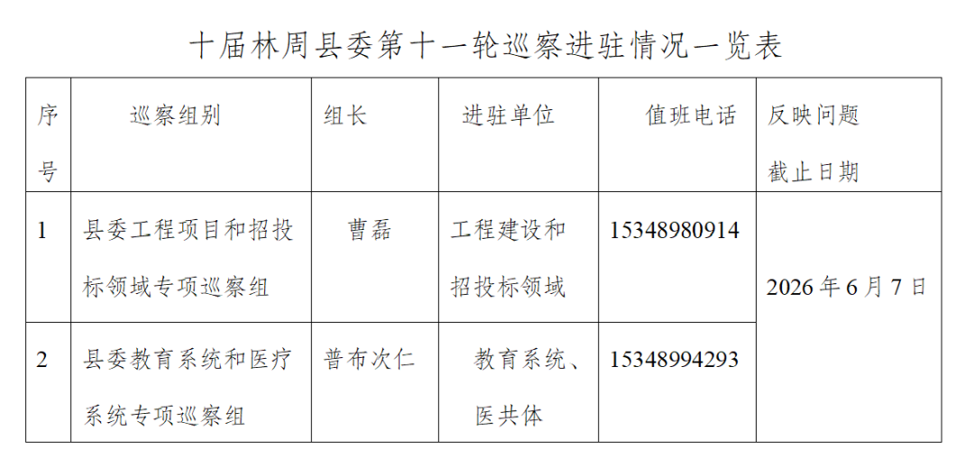 根据县委统一安排部署,十届县委第十一轮巡察将派出2个巡察组,对住交、农科、水利、林草等涉及工程建设和招投标领域以及教育系统、医疗系统师德师风、医德医风、校园餐、“三包”经费使用、药品采购等开展专项巡察。