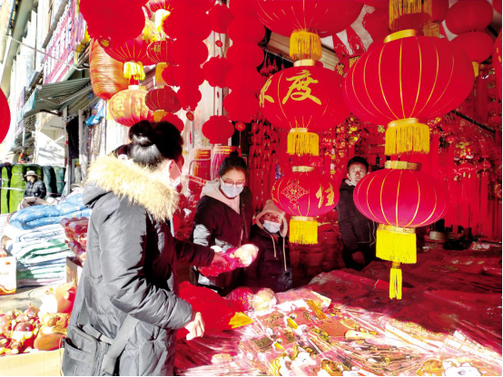 每年春节、藏历新年前是春联销售最红火的时候,市场里各式春联、大红福字、生肖贴画、精美的红灯笼等红色年货琳琅满目,前来选购春联及新年饰品的市民群众络绎不绝,十分热闹,整个市场红红火火,年味十足。